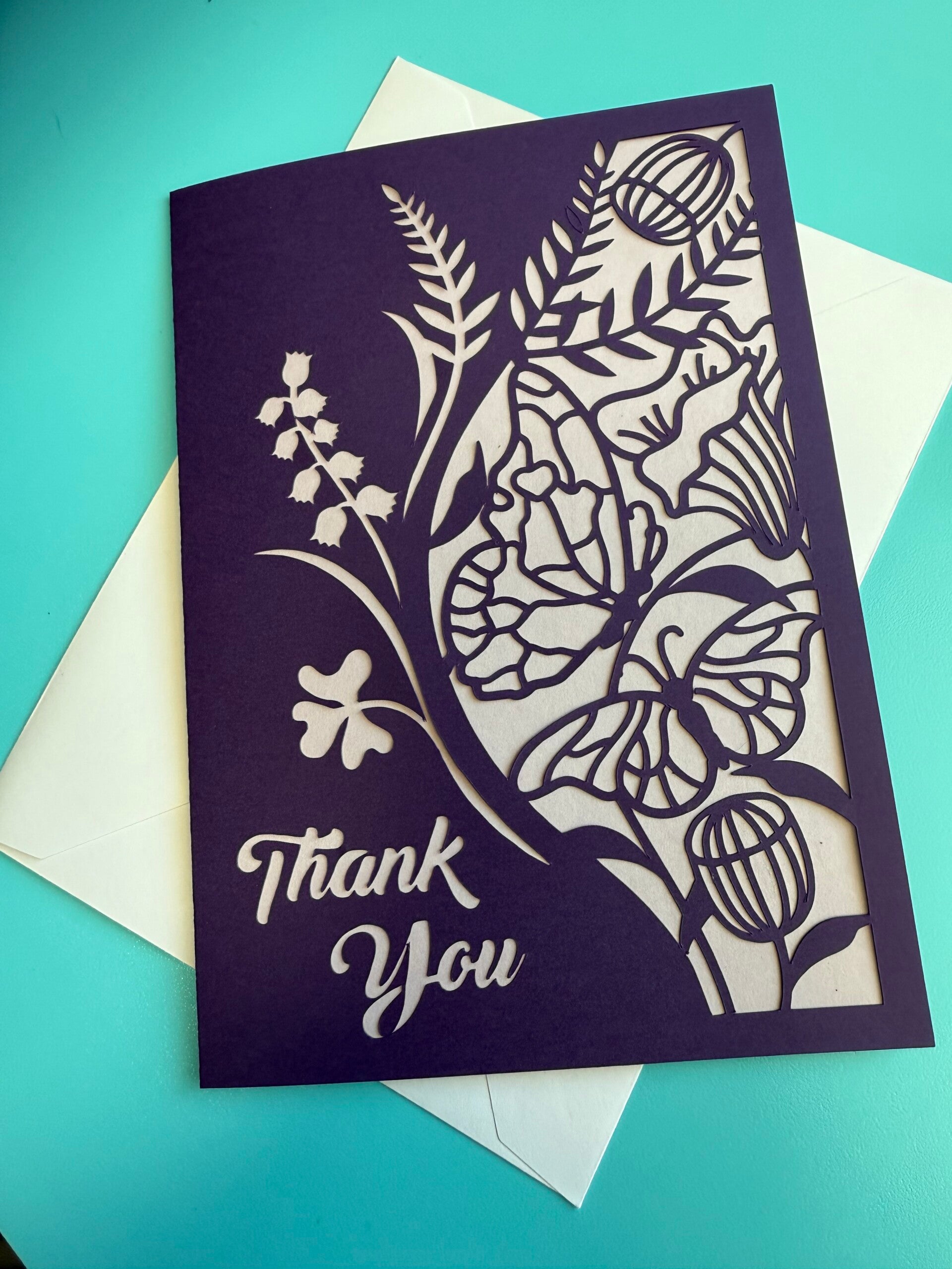 Say thank you with this beautiful lacy looking cut on a teal or royal purple card. This card is 5"W x 7"H which is great for a 'thank you' from a group; giving everyone space to write their thank you.