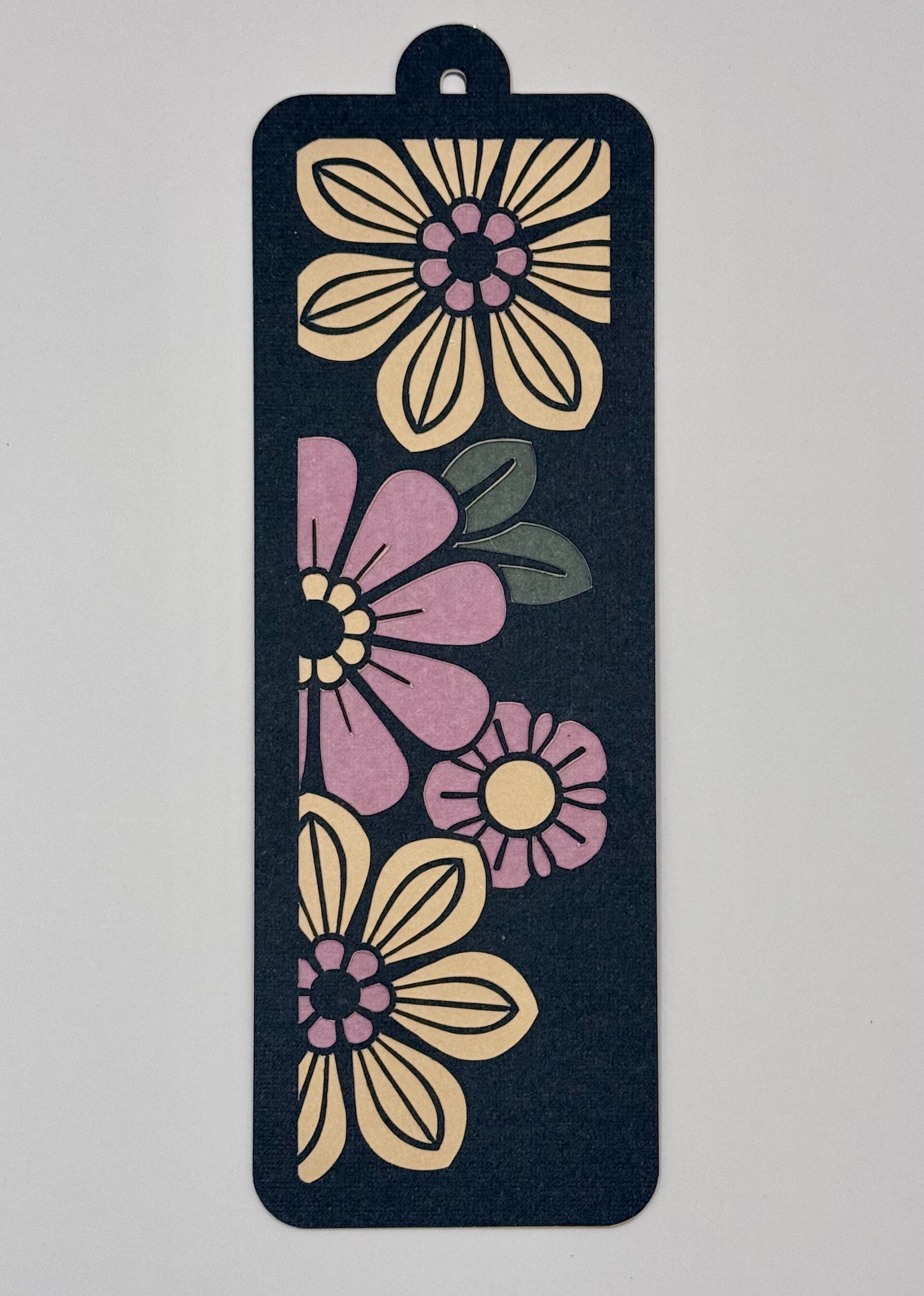 Bookmark has beautiful delicately cut layers. The four layers come together to create a floral stained glass looking floral mosaic standing out against a dark top layer. Made using high quality cardex in dusty tones.