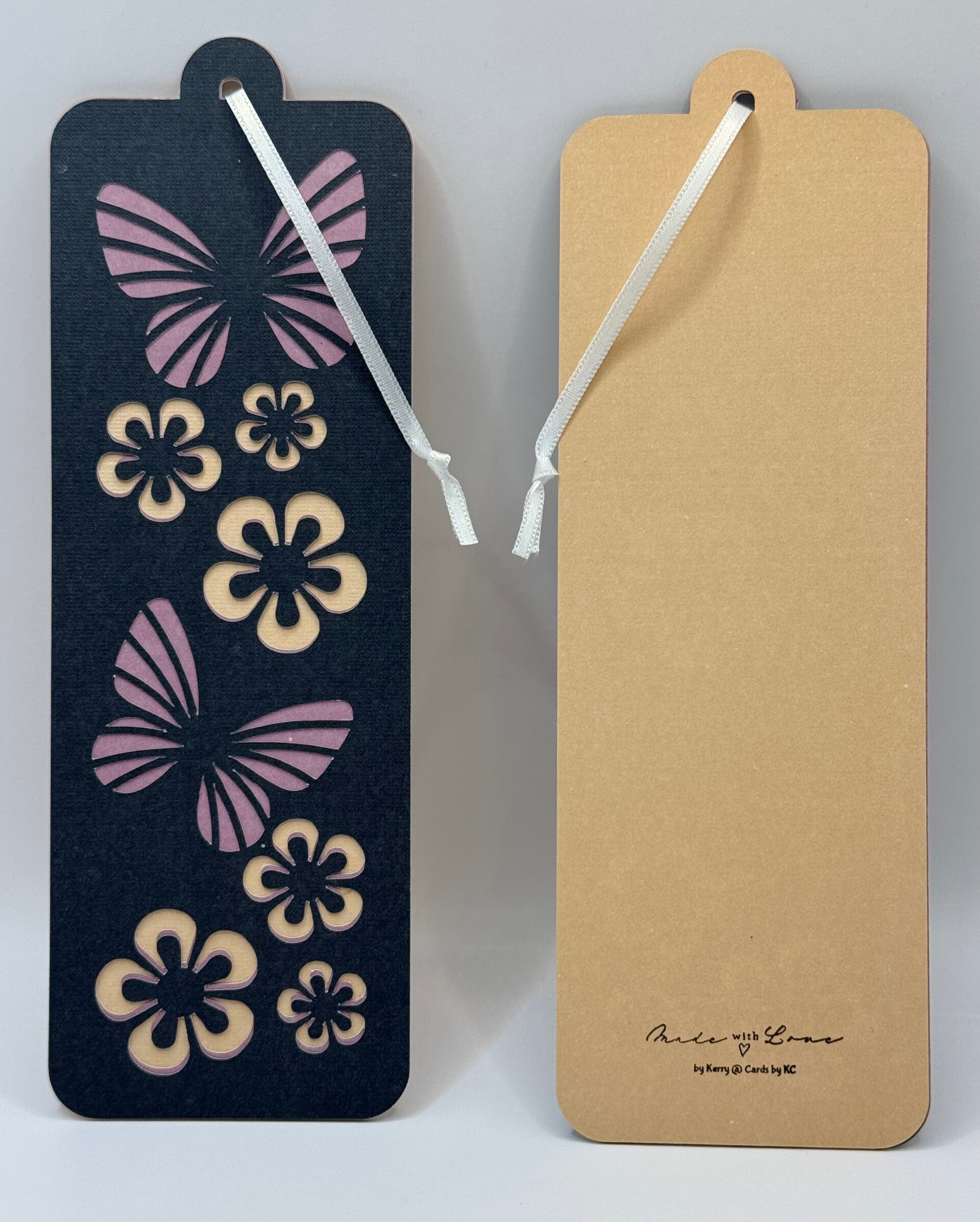 Bookmark has beautifully cut layers. The three layers come together to reveal pink butterflies amid yellow flowers. Made using high quality cardex in dusty tones.